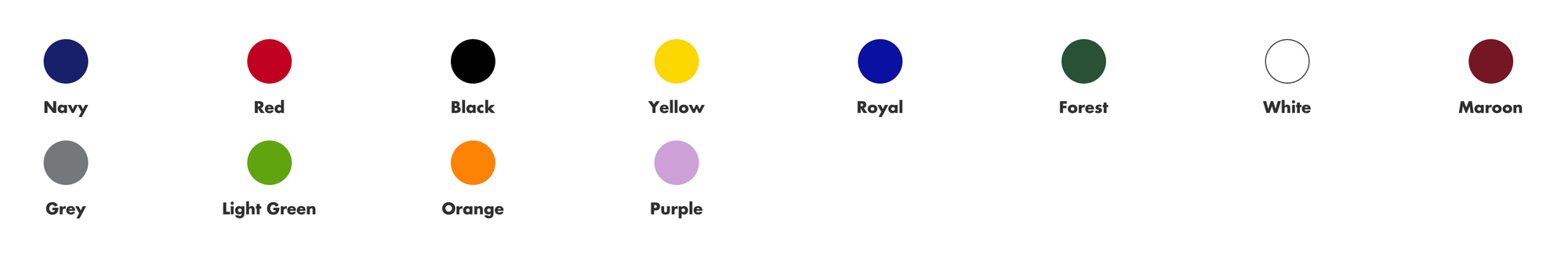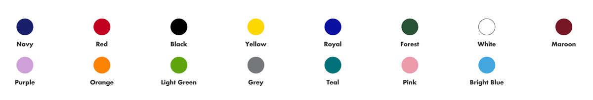 Options: Navy, Red, Black, Yellow, Royal, Forest, White, Maroon, Purple, Orange, Light Green, Grey, Teal, Pink, Bright Blue