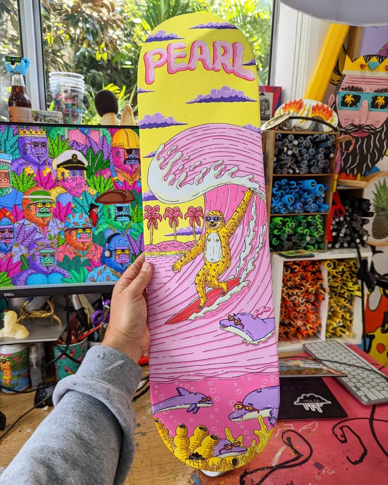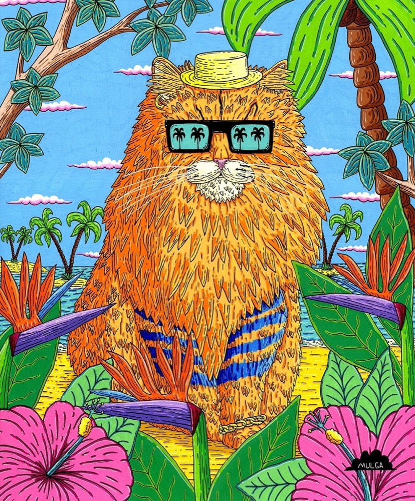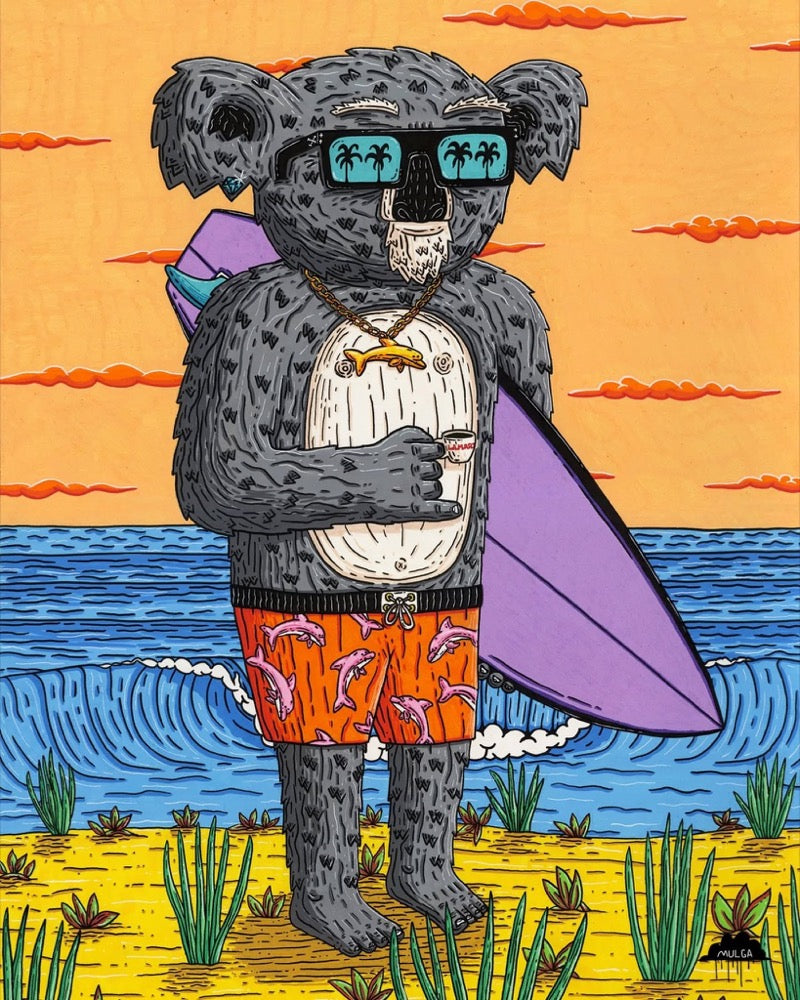 After having his first art show and launching his art career in 2012 he left his finance job in 2014 to become a full-time art dude. Mulga loves the beach and surfing and his summer inspired designs bring to life a world where tropical bearded men run rampant, tigers wear diamond sunglasses and gorillas rule the world like some kind of funky planet of the apes.